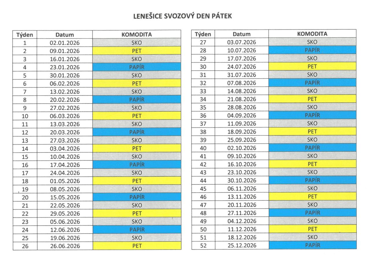 Plán vývozů popelnic v roce 2026